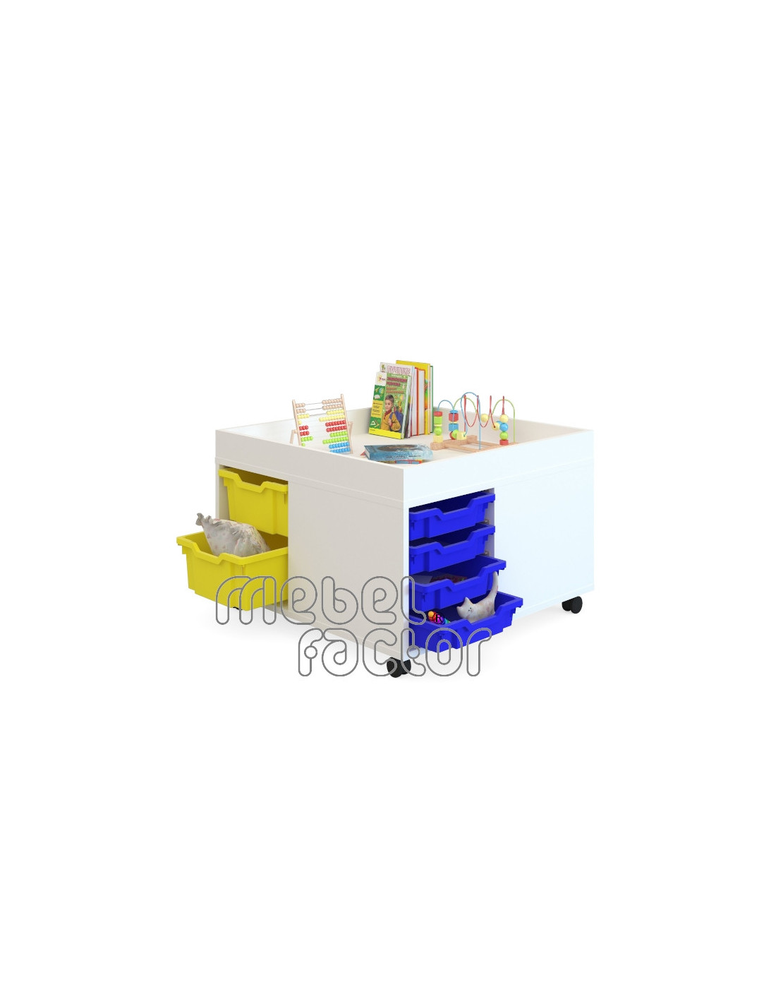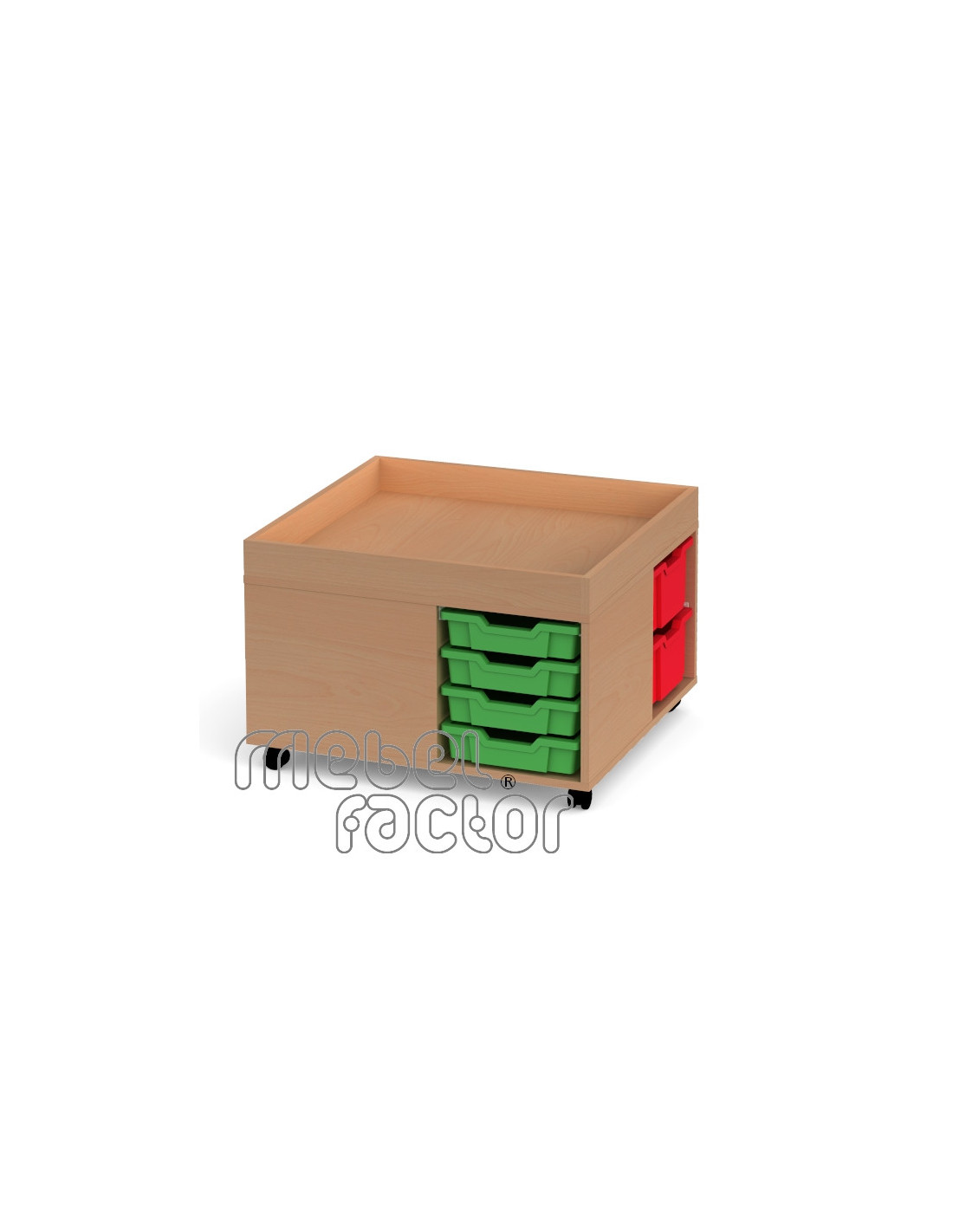 Подвижен шкаф с 8 цветни контейннера F1 и четири контейнера F2. Корпус от 18 мм ламинирано ПДЧ с кант 0,5мм. Стабилна конструкция с плътен гръб и колела. Декори на ламинирано ПДЧ от фирмения картел. Шкафа съдържа: 8 броя цветен контейнер F1 4 броя цветен контейнер F2 Произведено в България.