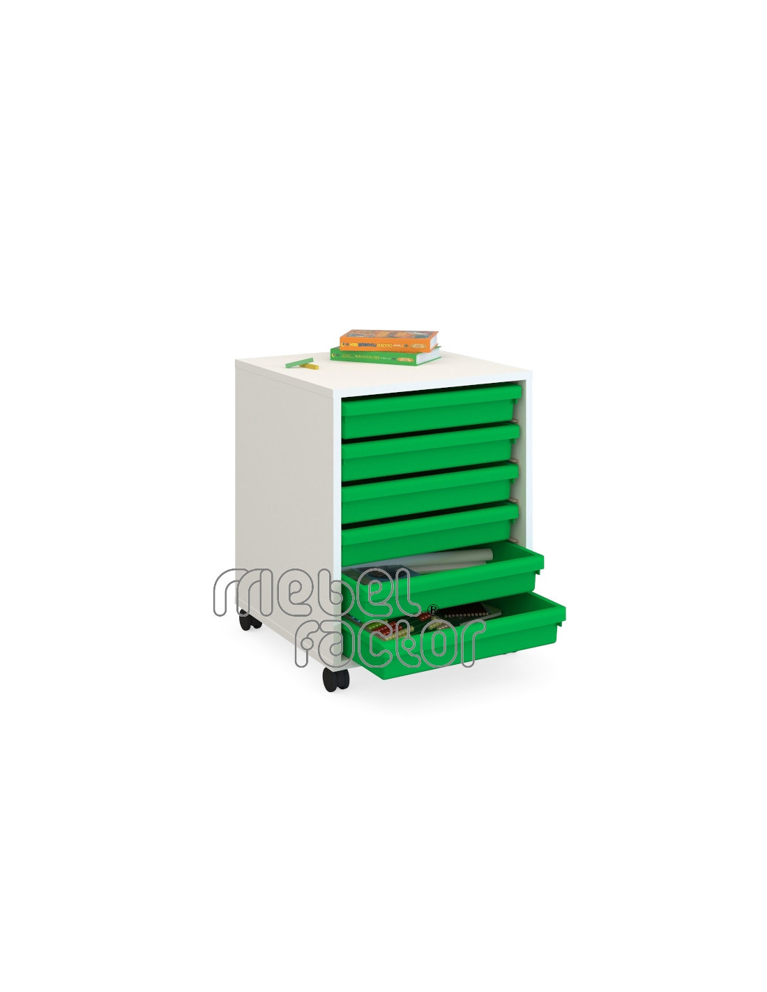 Подвижен шкаф с 6 цветни контейннера за хартия А3. Корпус от 18 мм ламинирано ПДЧ с кант 0,5мм. Стабилна конструкция с плътен гръб и колела. Декори на ламинирано ПДЧ от фирмения картел. Шкафа съдържа: 6 броя цветен контейнер за хартия А3. Произведено в България.