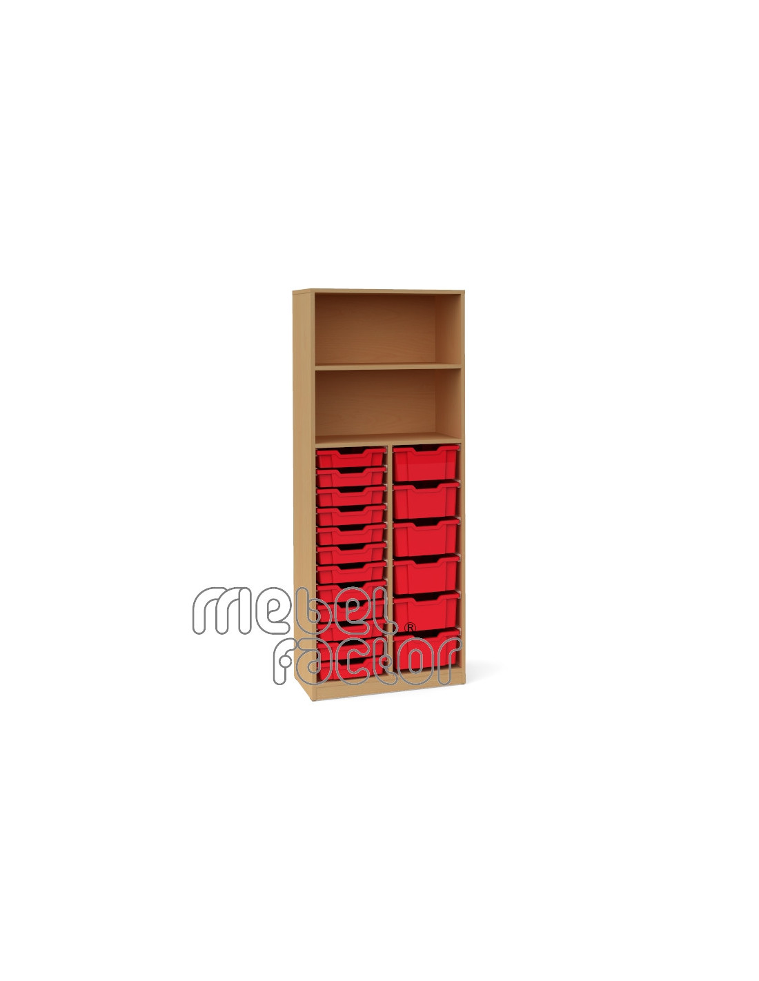 Двоен шкаф с 18 контейнера Gratnells Корпус от 18 мм ламинирано ПДЧ с кант 0,5мм Възможност за монтаж на врати. Стабилна конструкция с плътен гръб. Декори на ламинирано ПДЧ от фирмения картел. Шкафа съдържа: 12 броя плитък контейнер F1 6 броя среден контейнер F2 Произведено в България.