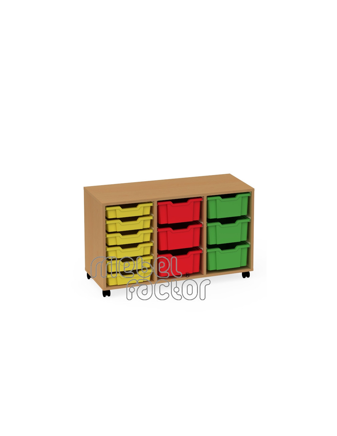 Подвижен троен шкаф с 12 контейнера Gratnells Корпус от 18 мм ламинирано ПДЧ с кант 0,5мм Стабилна конструкция с плътен гръб и колела. Декори на ламинирано ПДЧ от фирмения картел. Шкафа съдържа: 6 броя плитък контейнер F1 6 броя среден контейнер F2 Произведено в България.