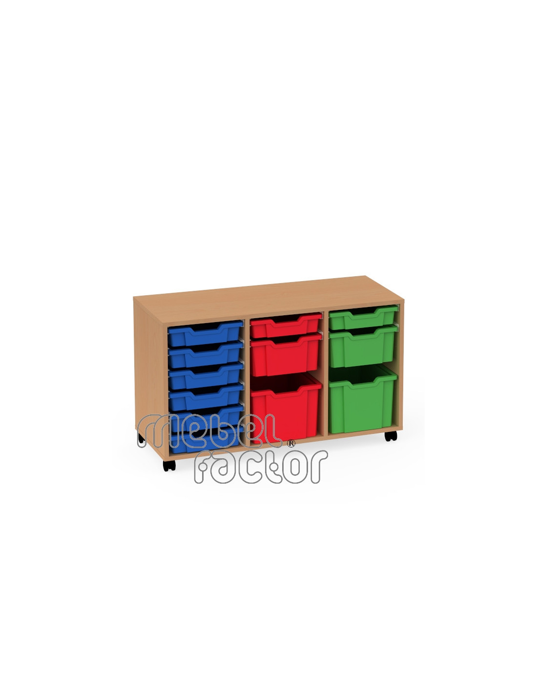 Подвижен троен шкаф с 12 контейнера Gratnells Корпус от 18 мм ламинирано ПДЧ с кант 0,5мм Стабилна конструкция с плътен гръб и колела. Декори на ламинирано ПДЧ от фирмения картел. Шкафа съдържа: 8 броя плитък контейнер F1 2 броя среден контейнер F2 2 броя дълбок контейнер F25 Произведено в България.