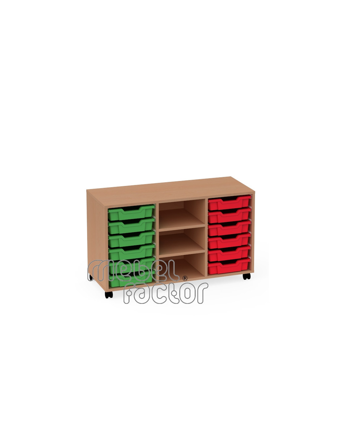 Подвижен троен шкаф с 12 контейнера Gratnells Корпус от 18 мм ламинирано ПДЧ с кант 0,5мм Стабилна конструкция с плътен гръб и колела. Декори на ламинирано ПДЧ от фирмения картел. Шкафа съдържа: 12 броя плитък контейнер F1 Произведено в България.