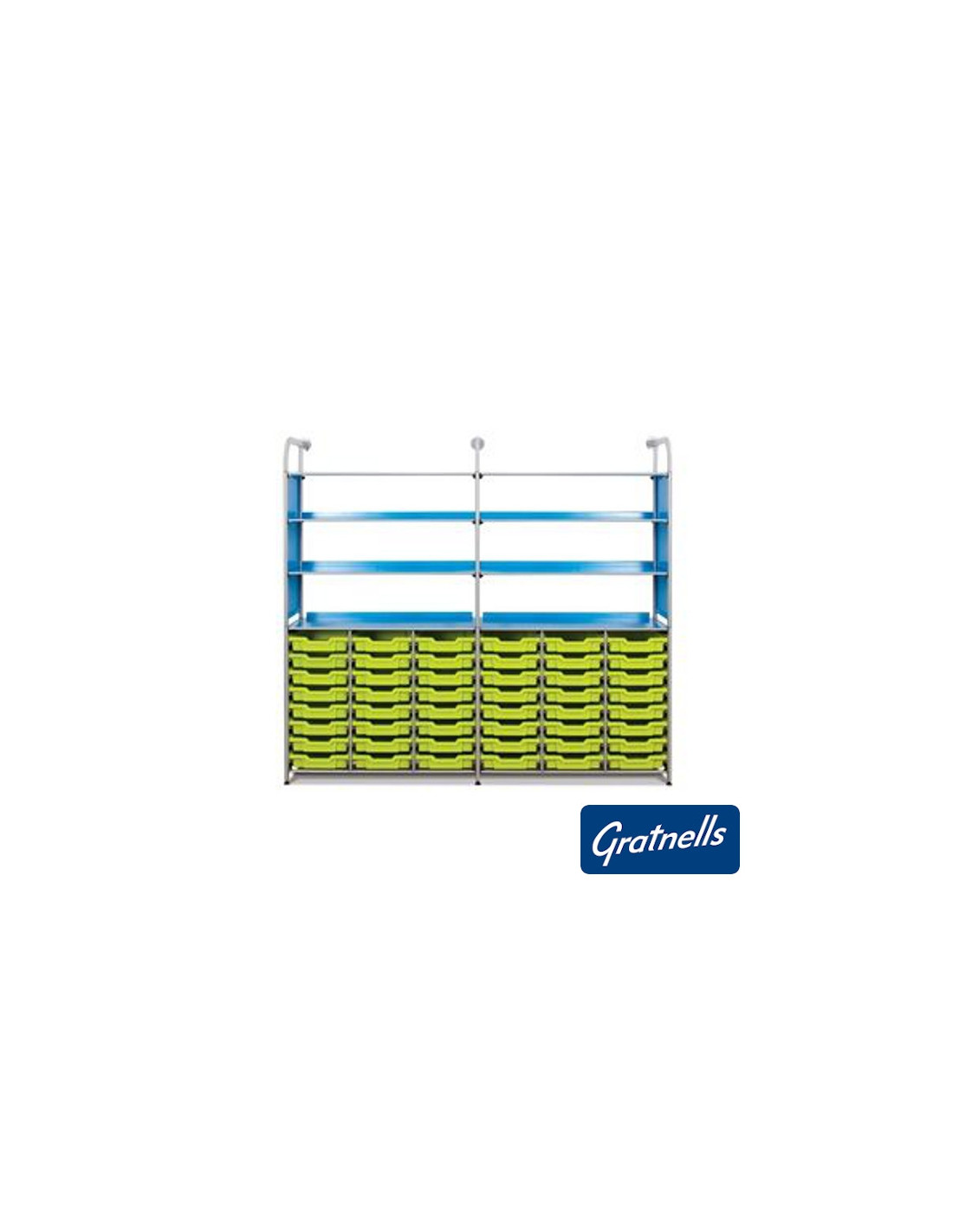Висока секция КАЛЕРО с 3 колони. КАЛЕРО е серия от модулни мебели, позволяващи разнообразни комбинации. Метална конструкция с прахово покритие RAL9006. Комплектът съдържа: · 48 плитки пластмасиви контейнера (F1) · 6 рафта (плоски) - 2 модула · 48 плъзгача StopSafe