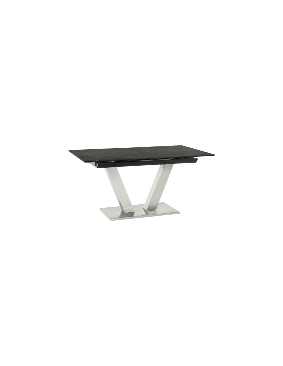 Демонстрация на вкус Трапезната маса DUKLA се отличава с оригинален и функционален дизайн. Нейната основа е от неръждаема стомана, от центъра на която се издига V-образна база, играеща ролята на крака, а интересният правоъгълен плот е изработен от висококачествена керамика и закалено стъкло. За още по-голямо удобство, моделът е снабден с разтегателен механизъм. Интересната визия и форма на модела ще придадат необичаен характер и изискана атмосфера на вашата трапезария! |