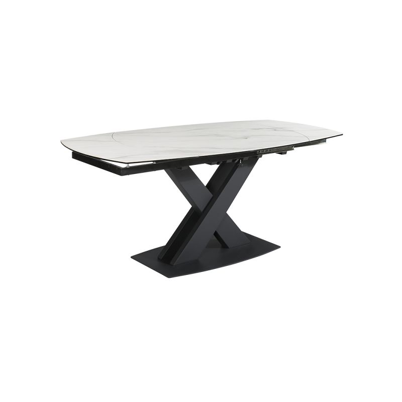 KARLINO е разтегателна трапезна маса, която се отличава с високо качество и съвременни линии. Плотът на модела е изработен от керамика, а Х-образната основа от праховобоядисан метал. Благодарение на функцията за разтягане, дължината на масата достига от 120 см до 180 см, за да имате повече място за посрещане на приятели и близки.