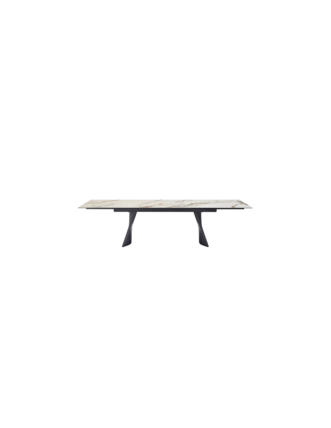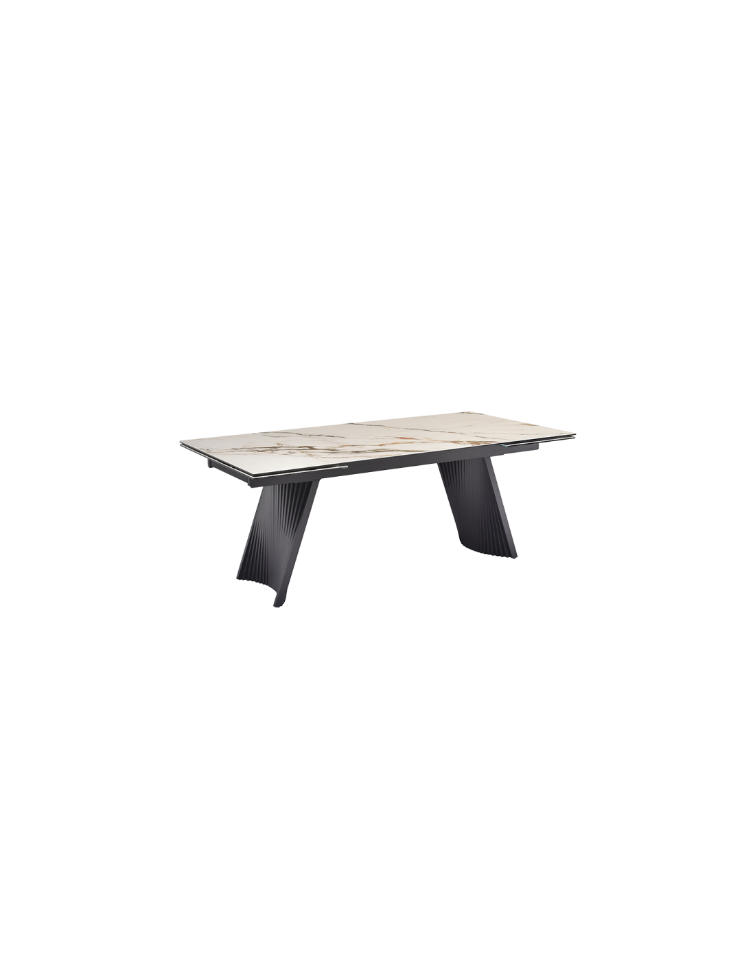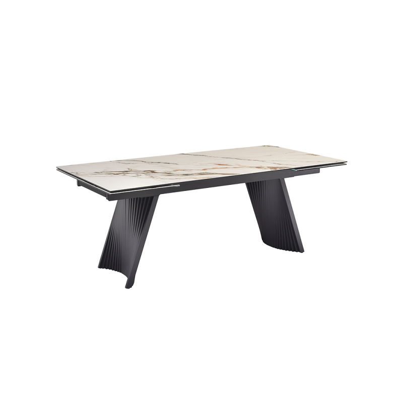 Трапезна маса KOWAL е истински шедьовър на съвременния дизайн, създаден да впечатлява с елегантност и функционалност. Плотът е с дебелина 13 мм и представлява изящно съчетание от закалено стъкло и керамика, което придава устойчивост и изискан мраморен ефект. Изчистените линии и гладката текстура добавят усещане за лукс и стил. Основата е изработена от праховобоядисан метал в дълбок черен цвят, отличаваща се с архитектурен и динамичен дизайн. Със своите ритмични, вълнообразни форми и изразителен силует, тя създава впечатление за движение и лекота, като същевременно гарантира изключителна стабилност. Интелигентният релсов механизъм позволява плавно разтягане на допълнителните плотове в двата края, превръщайки KOWAL от компактна маса с дължина 200 см в просторна маса от 300 см — идеална за семейни събирания и срещи с приятели. KOWAL съчетава в себе си естетика и практичност, правейки я централно бижу във всяка модерна трапезария.