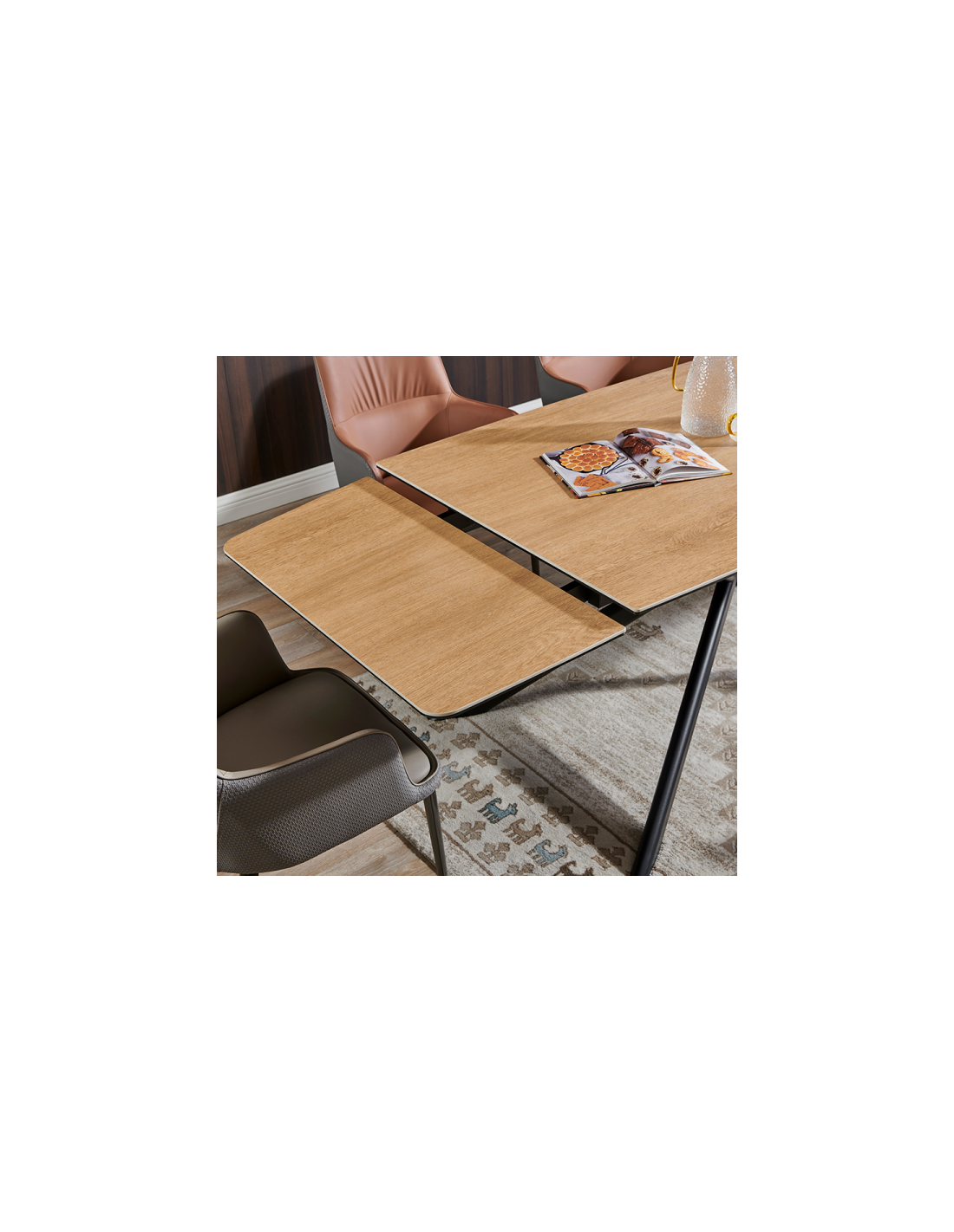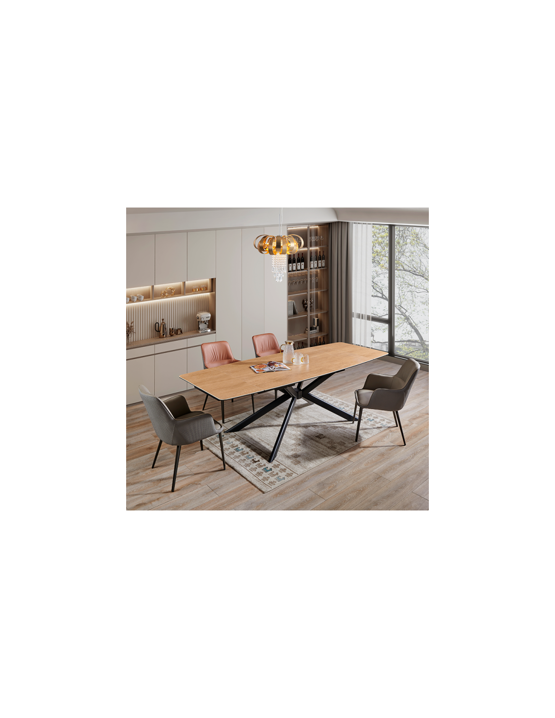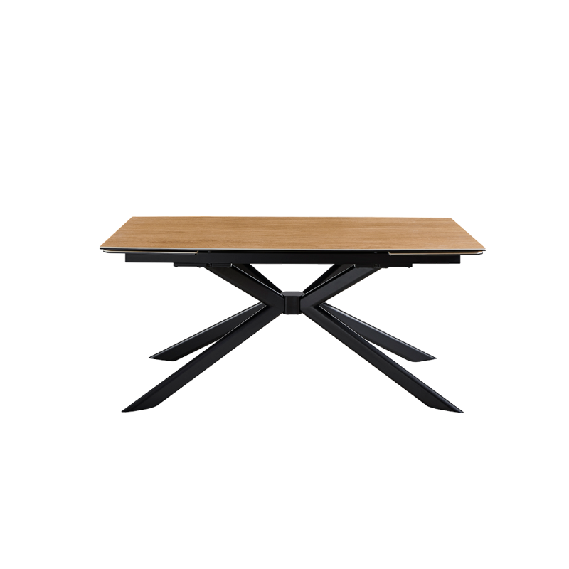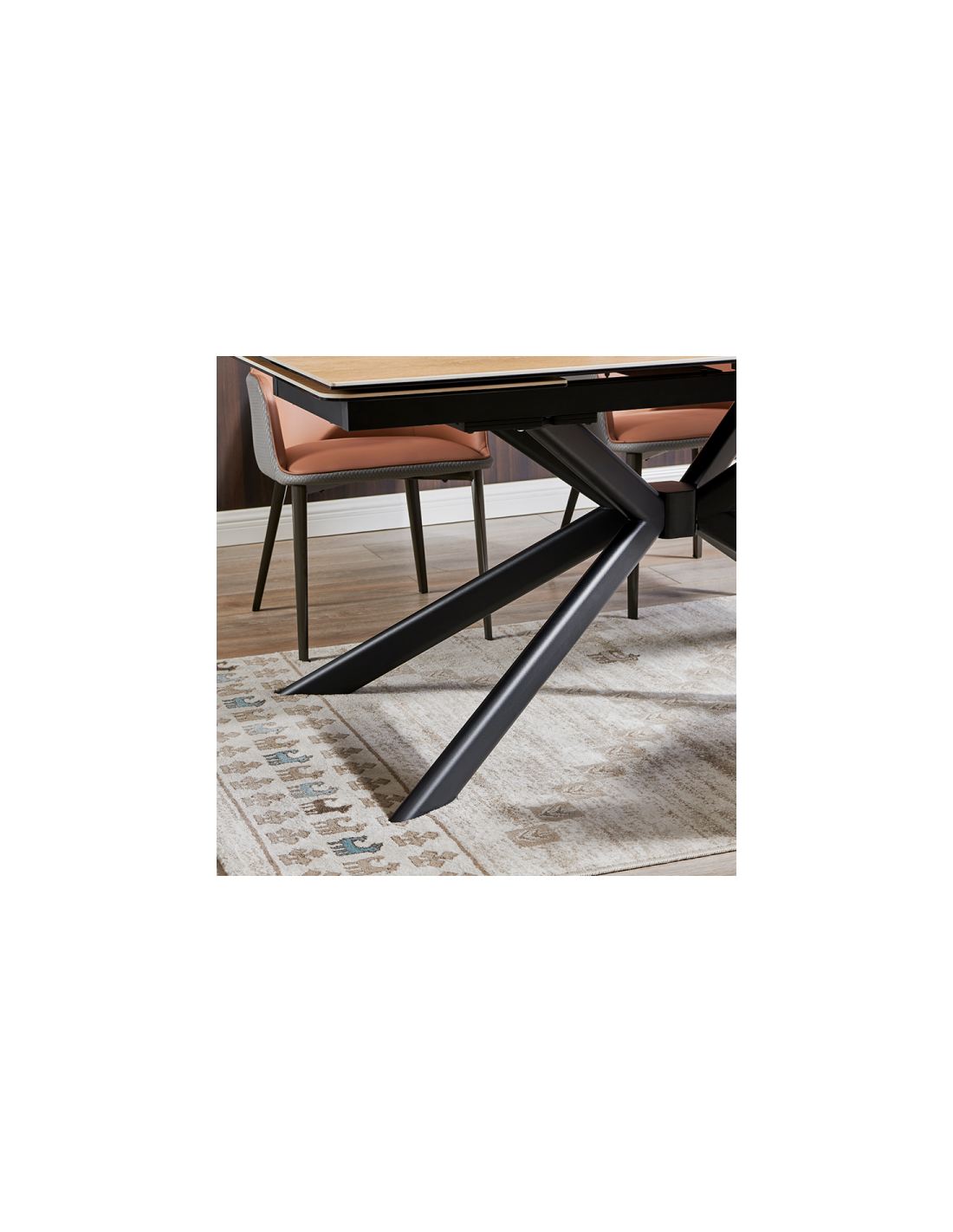 Разтегателна трапезна маса ANACO впечатлява с естествената си естетика и изчистен дизайн, който допълва всяка съвременна трапезария. Плотът комбинира закалено стъкло и керамика с дървесен цвят, създавайки хармония между издръжливост и стил. Здравата основа от праховобоядисан метал осигурява стабилност и надеждност. Със стандартна дължина от 160 см, която може да се разшири до впечатляващите 240 см благодарение на практичен разтегателен механизъм, масата предоставя достатъчно пространство за специални поводи и ежедневни събирания. ANACO е перфектният избор за тези, които търсят комбинация от функционалност и естествена красота.