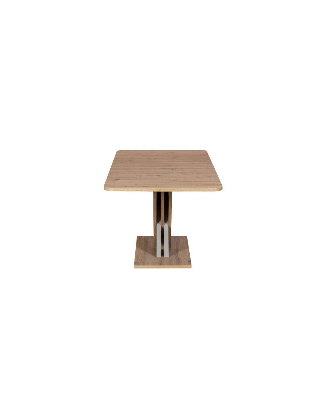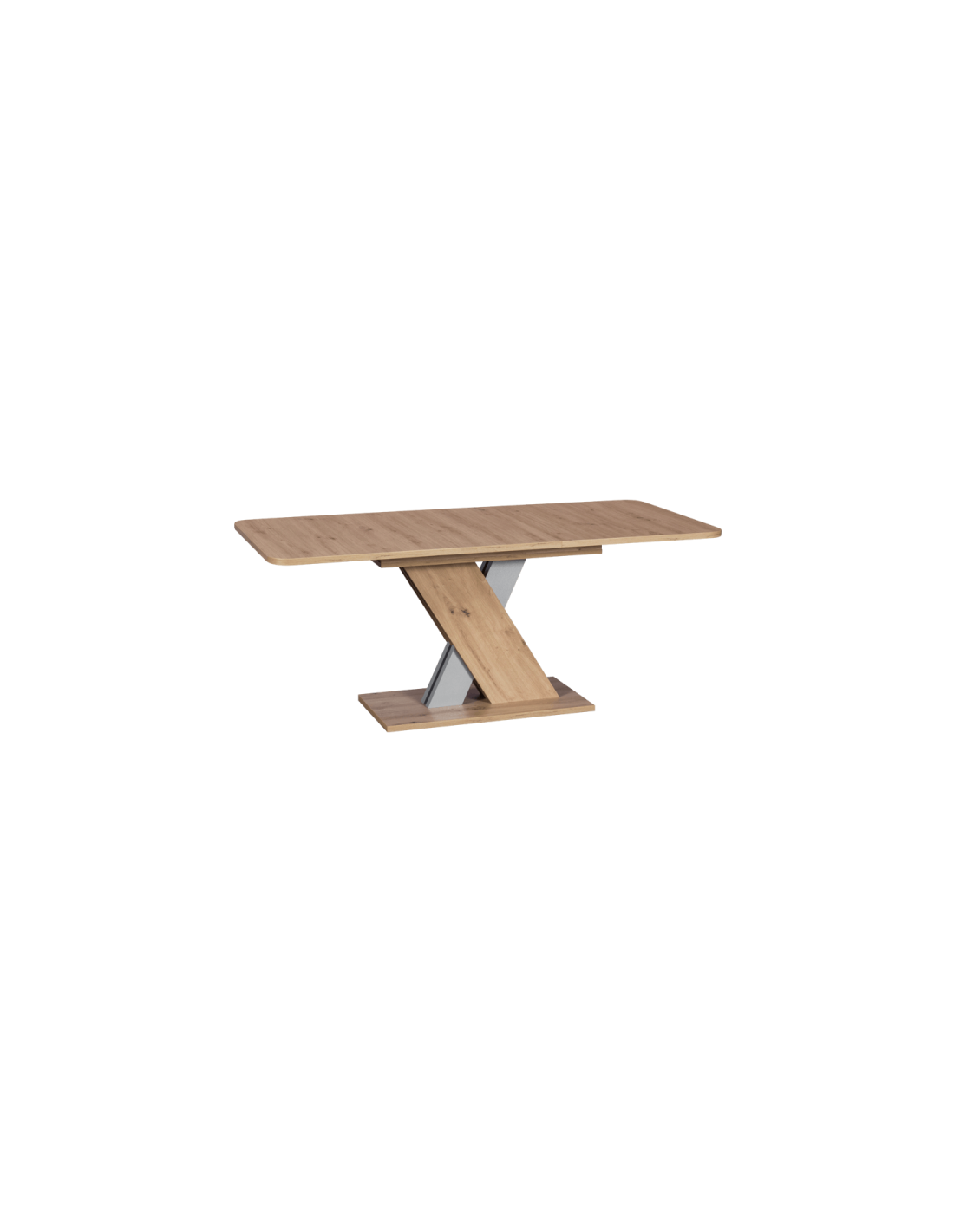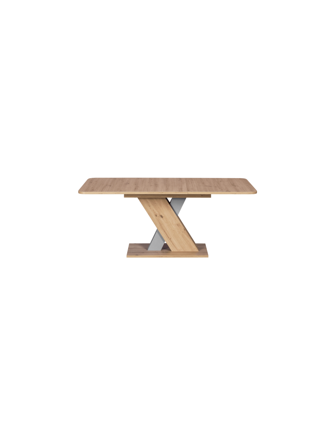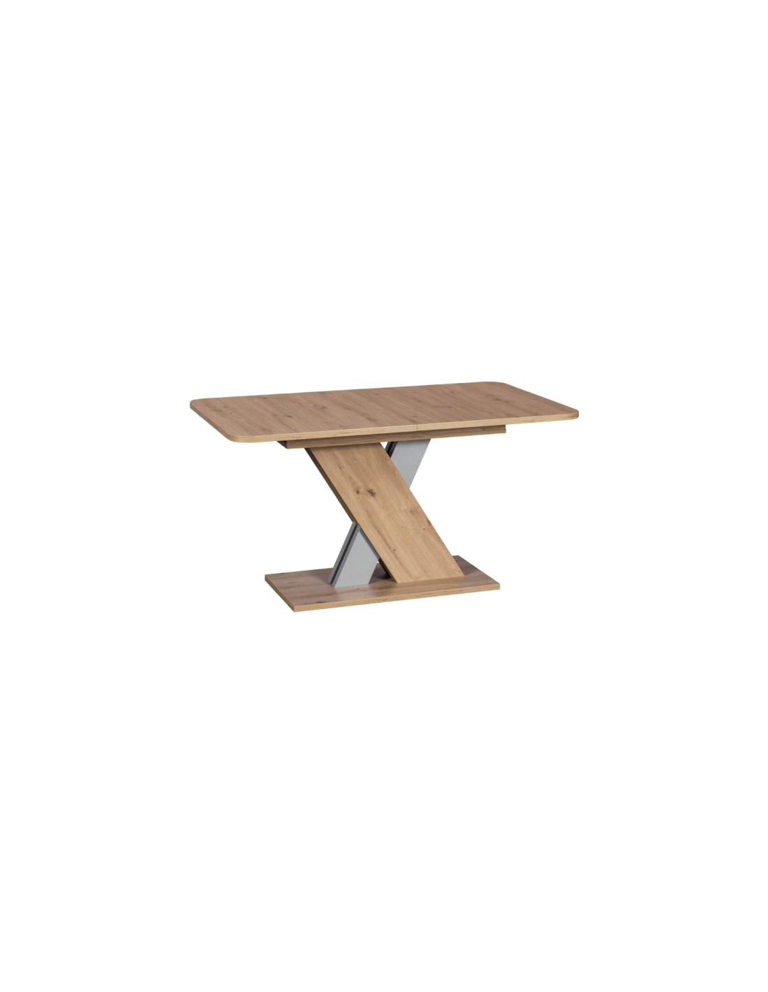 Стилен и практичен избор за трапезарията Трапезната маса DINAR е модел от ново поколение с интересен, стилен дизайн и практична функция за разтягане. Тя съчетава нестандартна основа, наподобяваща буквата X и правоъгълен плот със заоблени ъгли. Дървесната шарка и нежнините, меки цветове ще направят трапезарията елегантна и уютна. |