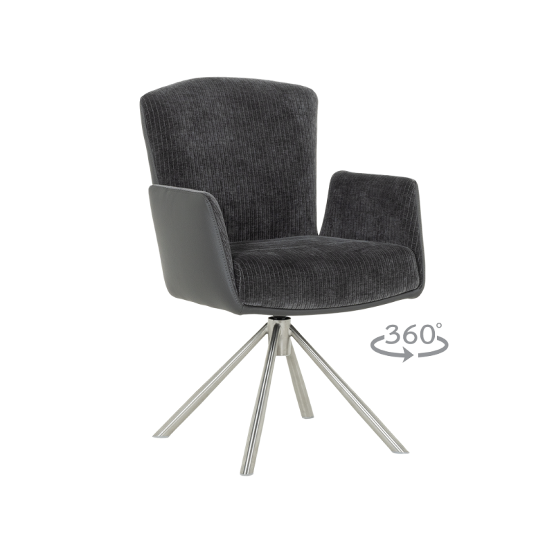 Ефектен дизайн и максимално удобство Трапезен стол SINDI е елегантен акцент за модерния интериор, подходящ както за дома, така и за луксозни обществени пространства. Широката седалка и ергономичната облегалка осигуряват максимален комфорт, допълнен от вградената система от покет пружини, която равномерно разпределя тежестта за оптимално удобство. Облегалката с функция за накланяне назад и високите тапицирани подлакътници предлагат идеалната комбинация за релакс. Столът е снабден с въртящ се механизъм на 360°, който улеснява движението във всички посоки, както и с функция за автоматично връщане в изходна позиция за допълнително удобство. Модерната основа от неръждаема стомана подчертава авангардния дизайн, като същевременно осигурява стабилност и устойчивост. |