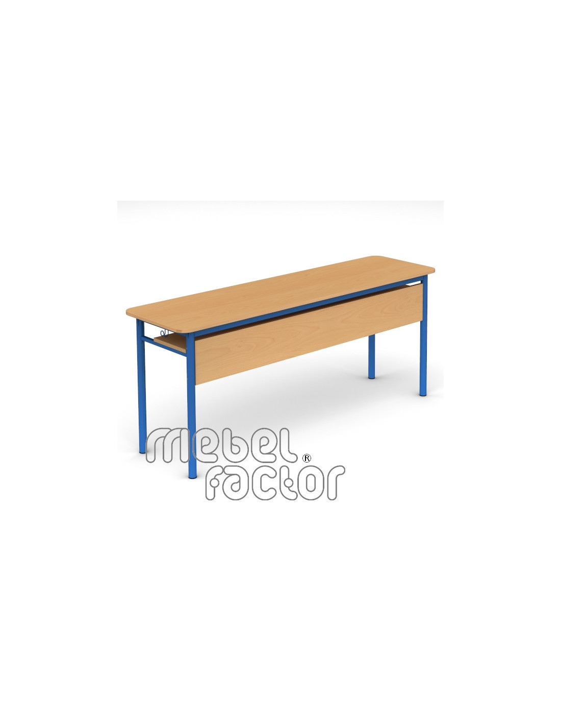 Триместна ученическа маса РОНДО, размер 6. Подходяща за възраст над 14 години. Вариант със заоблени ъгли на плота. Плот с размери 180х50/Н76см., кант 2,0мм. Чело и рафт от ламинирано ПДЧ с дебелина 18мм. Декори на ламинирано ПДЧ от фирмения картел. Заварена конструкция с крака от тръба 40мм. Включени 2 броя закачалки за ученическа чанта. Полимерно, прахово покритие в цветове по RAL. Произведено в България. Продуктът отговаря на стандарт БДС EN 1729 - "Мебели. Столове и маси за учебни заведения."