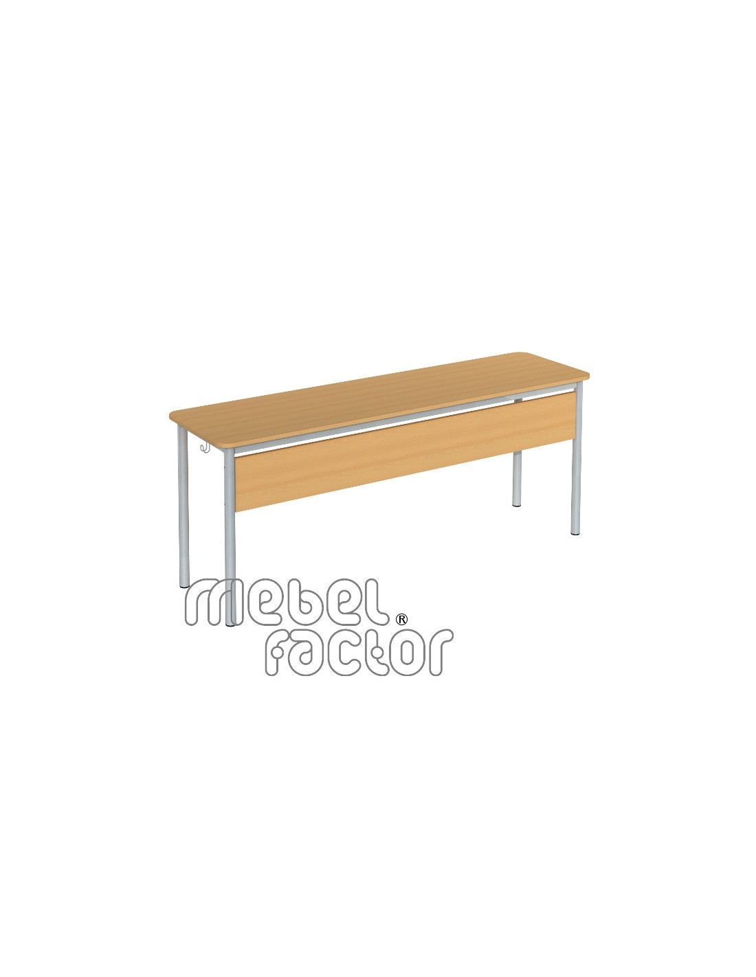 Триместна ученическа маса РОНДО, размер 6. Подходяща за възраст над 14 години. Вариант със заоблени ъгли на плота. Плот с размери 180х50/Н76см., кант 2,0мм. Чело от ламинирано ПДЧ с дебелина 18мм. Декори на ламинирано ПДЧ от фирмения картел. Заварена конструкция с крака от тръба 40мм. Включени 2 броя закачалки за ученическа чанта. Полимерно, прахово покритие в цветове по RAL. Произведено в България. Продуктът отговаря на стандарт БДС EN 1729 - "Мебели. Столове и маси за учебни заведения."