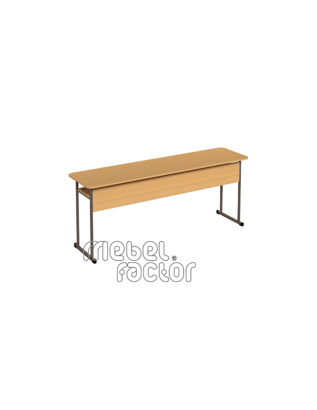 Триместна ученическа маса УНИВЕРСАЛ, размер 6. Подходяща за възраст над 14 години. Вариант със заоблени ъгли на плота. Плот с размери 180х50/Н76см., кант 2,0мм. Чело и рафт от ламинирано ПДЧ с дебелина 18мм. Декори на ламинирано ПДЧ от фирмения картел. Заварена конструкция от тръба 20х20мм. Включени 2 броя закачалки за ученическа чанта. Полимерно, прахово покритие в цветове по RAL. Произведено в България. Продуктът отговаря на стандарт БДС EN 1729 - "Мебели. Столове и маси за учебни заведения."