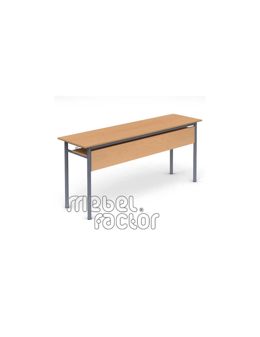 Триместна ученическа маса РОНДО, размер 7. Подходяща за възраст от над 18 години. Вариант със заоблени ъгли на плота. Плот с размери 180х50/Н82см., кант 2,0мм. Чело и рафт от ламинирано ПДЧ с дебелина 18мм. Декори на ламинирано ПДЧ от фирмения картел. Заварена конструкция с крака от тръба 40мм. Включени 2 броя закачалки за ученическа чанта. Полимерно, прахово покритие в цветове по RAL. Произведено в България. Продуктът отговаря на стандарт БДС EN 1729 - "Мебели. Столове и маси за учебни заведения."