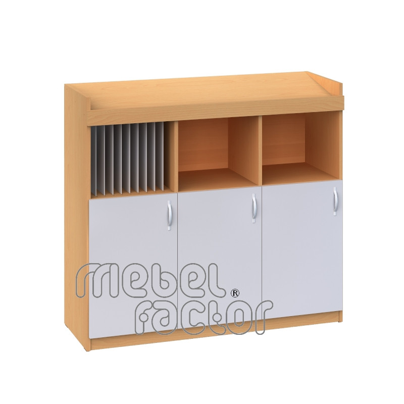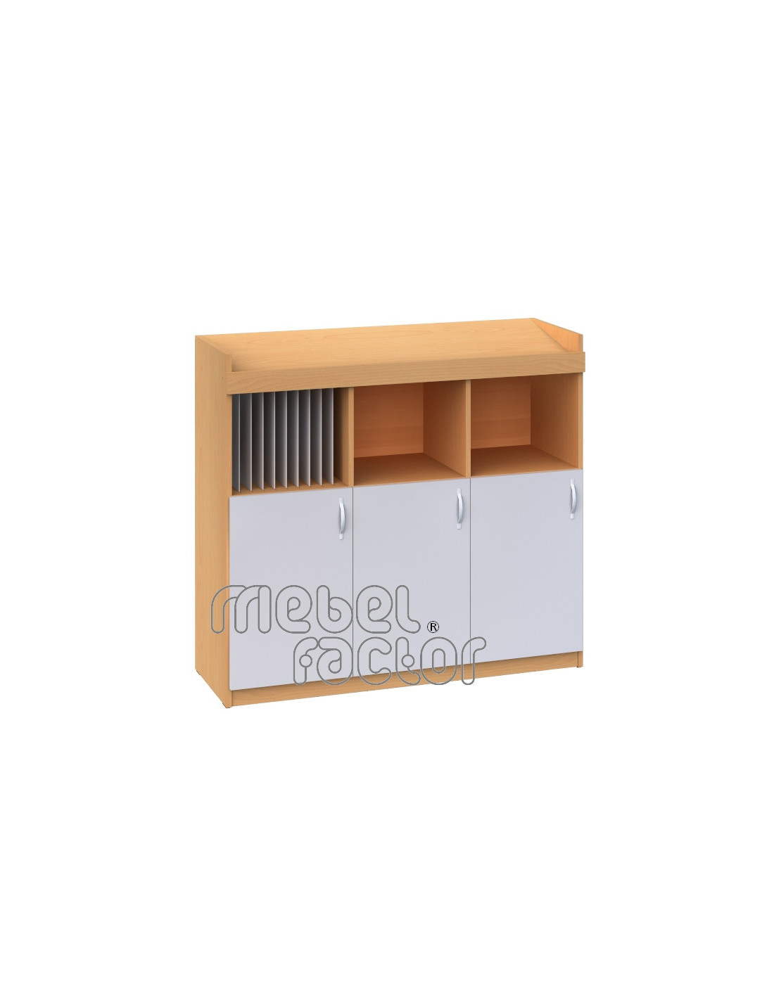 Учителски шкаф за 10бр. дневници с три врати. Корпус и врата от 18мм ламинирано ПДЧ и кант 0,5мм. Гръб от ламиниран HDF 3мм. Декори на ламинирано ПДЧ от фирмения картел. Размери на шкафа 130х45h118см. Произведено в България.