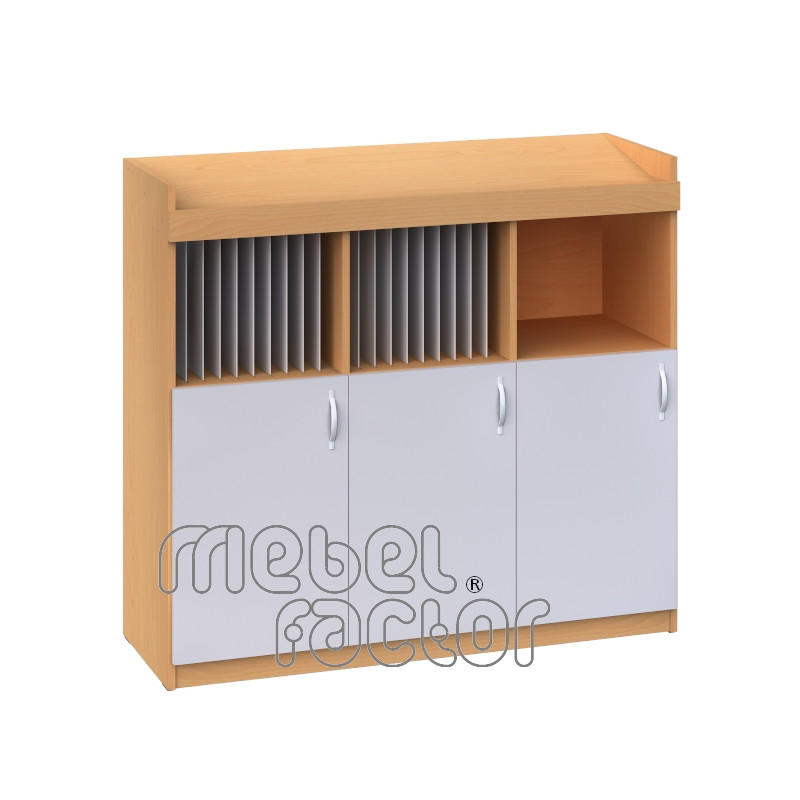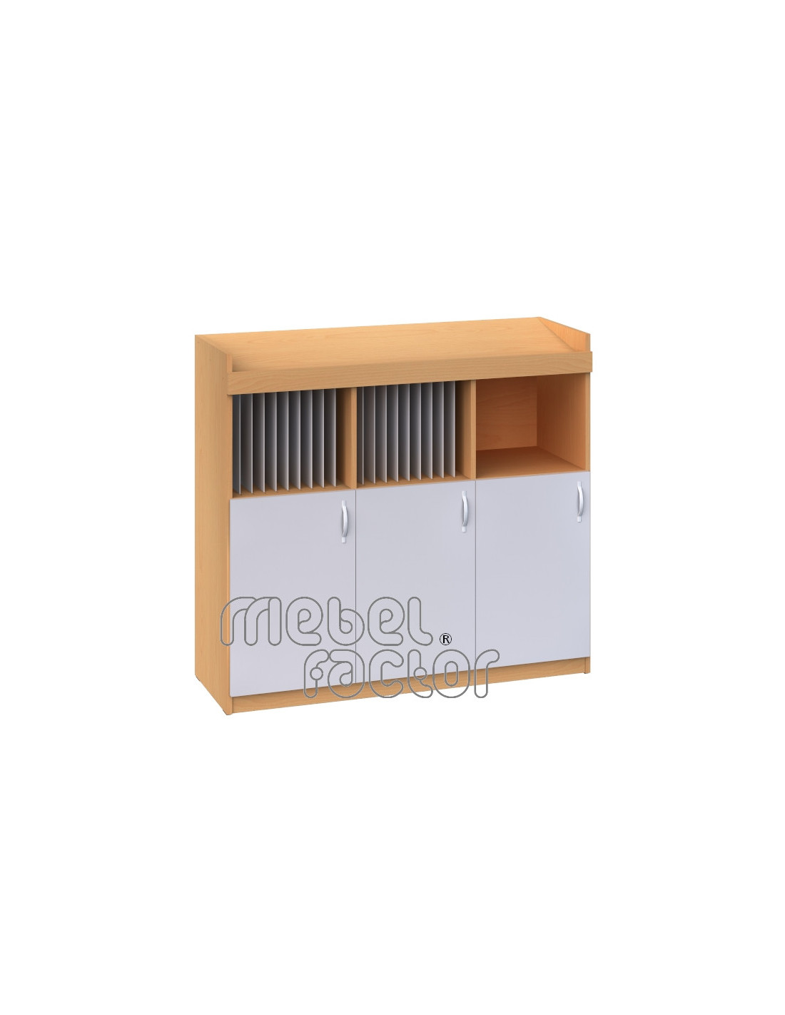 Учителски шкаф за 20бр. дневници с три врати. Корпус и врата от 18мм ламинирано ПДЧ и кант 0,5мм. Гръб от ламиниран HDF 3мм. Декори на ламинирано ПДЧ от фирмения картел. Размери на шкафа 130х45h118см. Произведено в България.