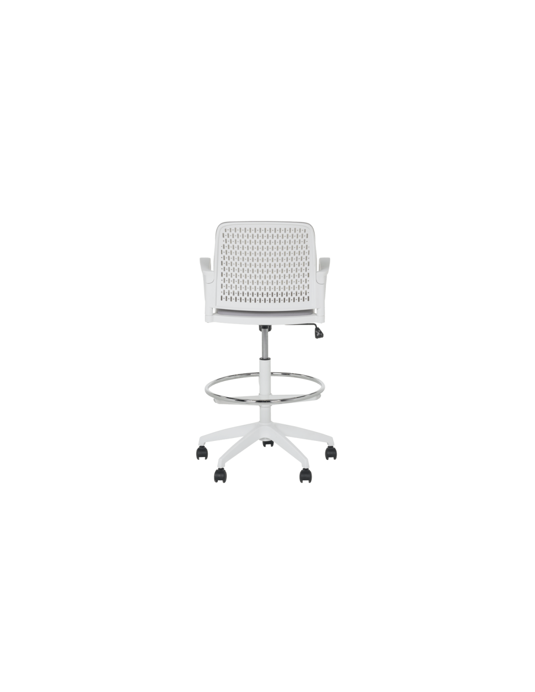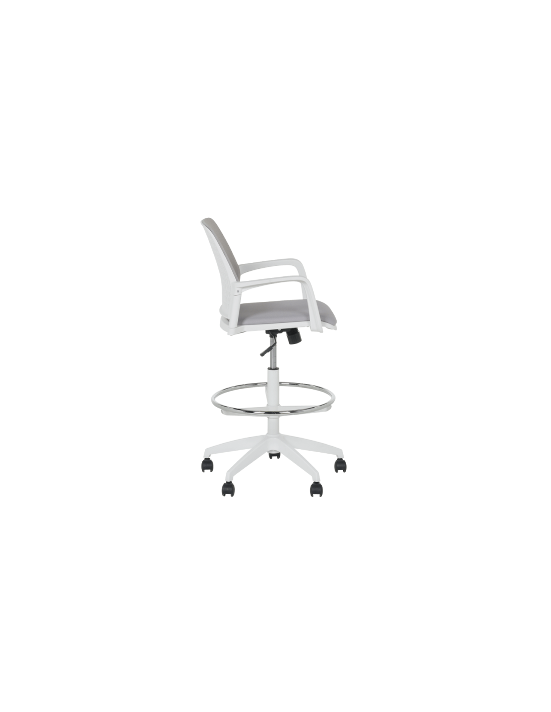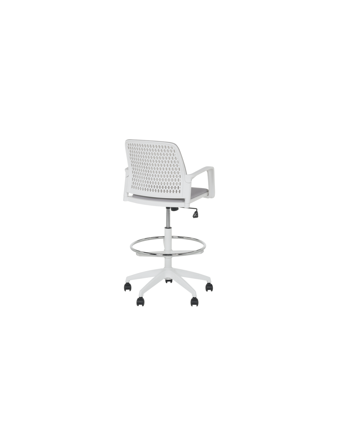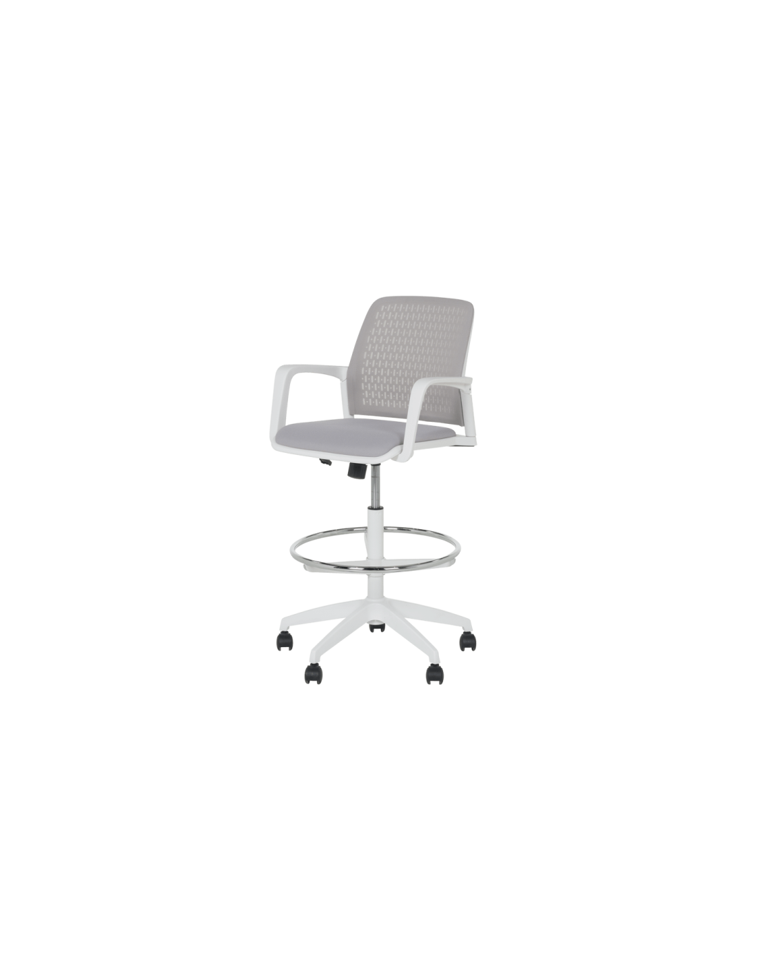 Работен офис стол Carmen 7556 W комбинира функционалност и комфорт. Благодарение на регулируемата си височина и хромирана степенка тип ринг, той може да се използва както като обикновен офис стол, така и като висок работен стол. Степенката осигурява удобна опора за краката и предпазва от неприятното усещане за „висящи“ крака при по-висока позиция на седалката. Седалката е тапицирана с дамаска, а облегалката е изработена от полипропилен с мрежеста структура за по-добра вентилация и циркулация на въздуха.
